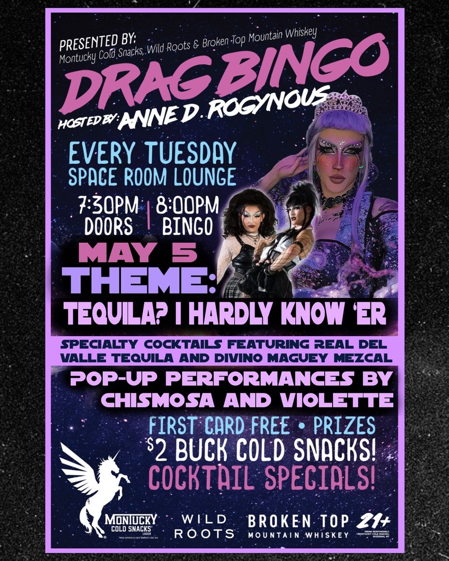 join us for an extra-special 'Cinco De Mayo' Drag Bingo on Tuesday, May 5th • Free • 21+ • Doors @ 7:30 PM • Bingo @ 8 PM • pop-up performances by Chismosa and Violette • drink specials from Real Del Valle Tequila and Divino Maguey Mezcal • $2 Taco Tuesday